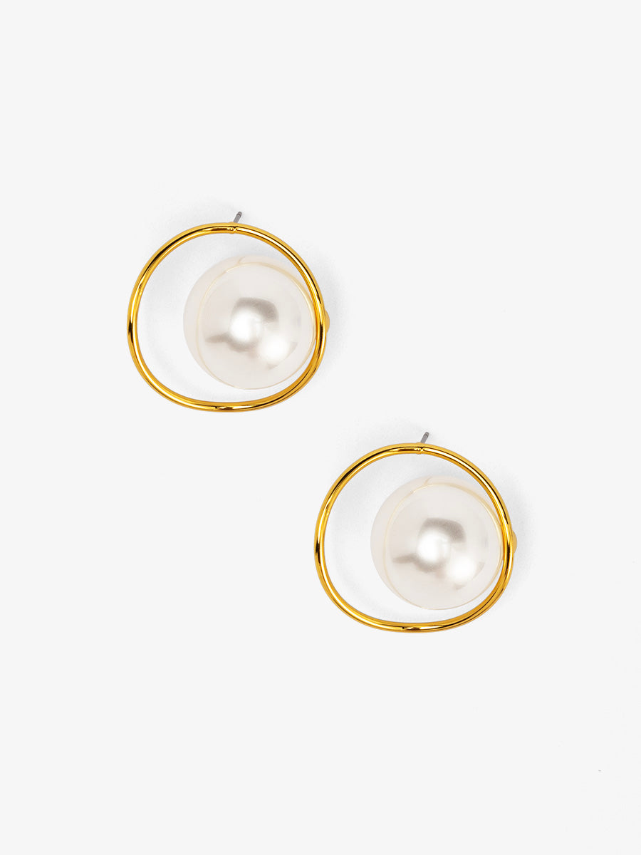 A polished hoop cradles a bold pearl at its center, blending clean lines with timeless sophistication.