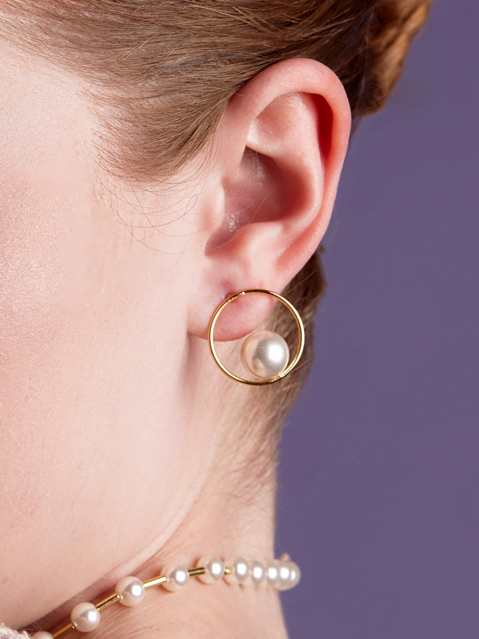 Drop earring features a lustrous faux pearl suspended at the center of a delicate gold-tone orbit circle.