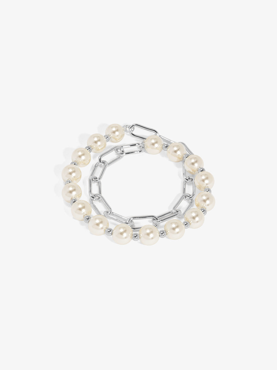Brass-based layered bracelet set with wrappable faux pearl stretch bracelet and 18K plated link bracelet.