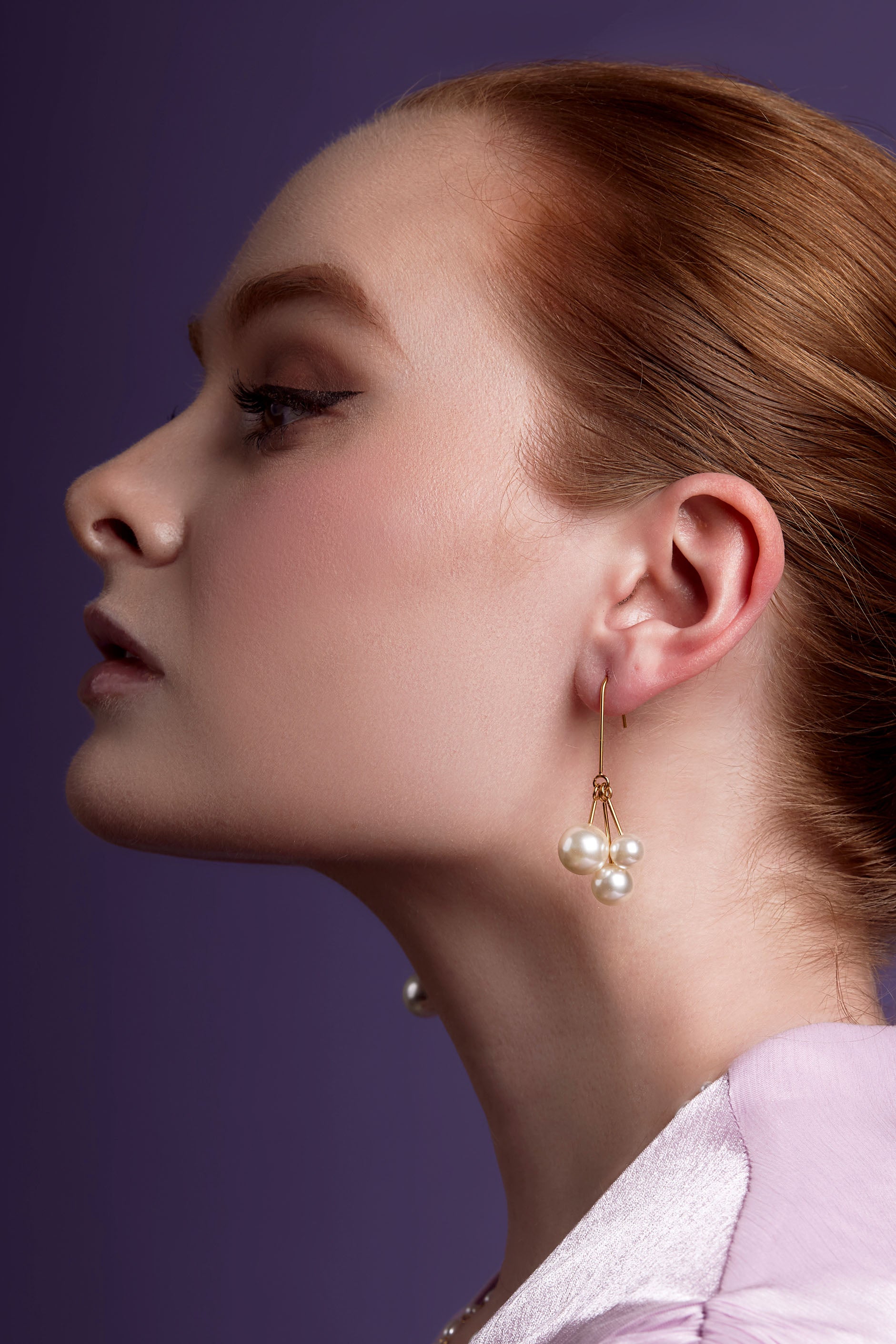 Drop earring featuring a cluster of pearls hanging from a sleek hook.
