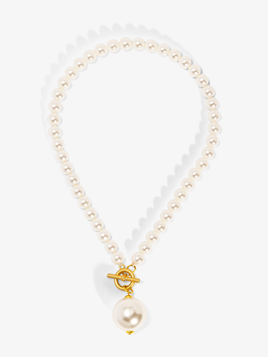 Collar necklace featuring an oversized pearl pendant and finished with an 18K gold-plated toggle closure.