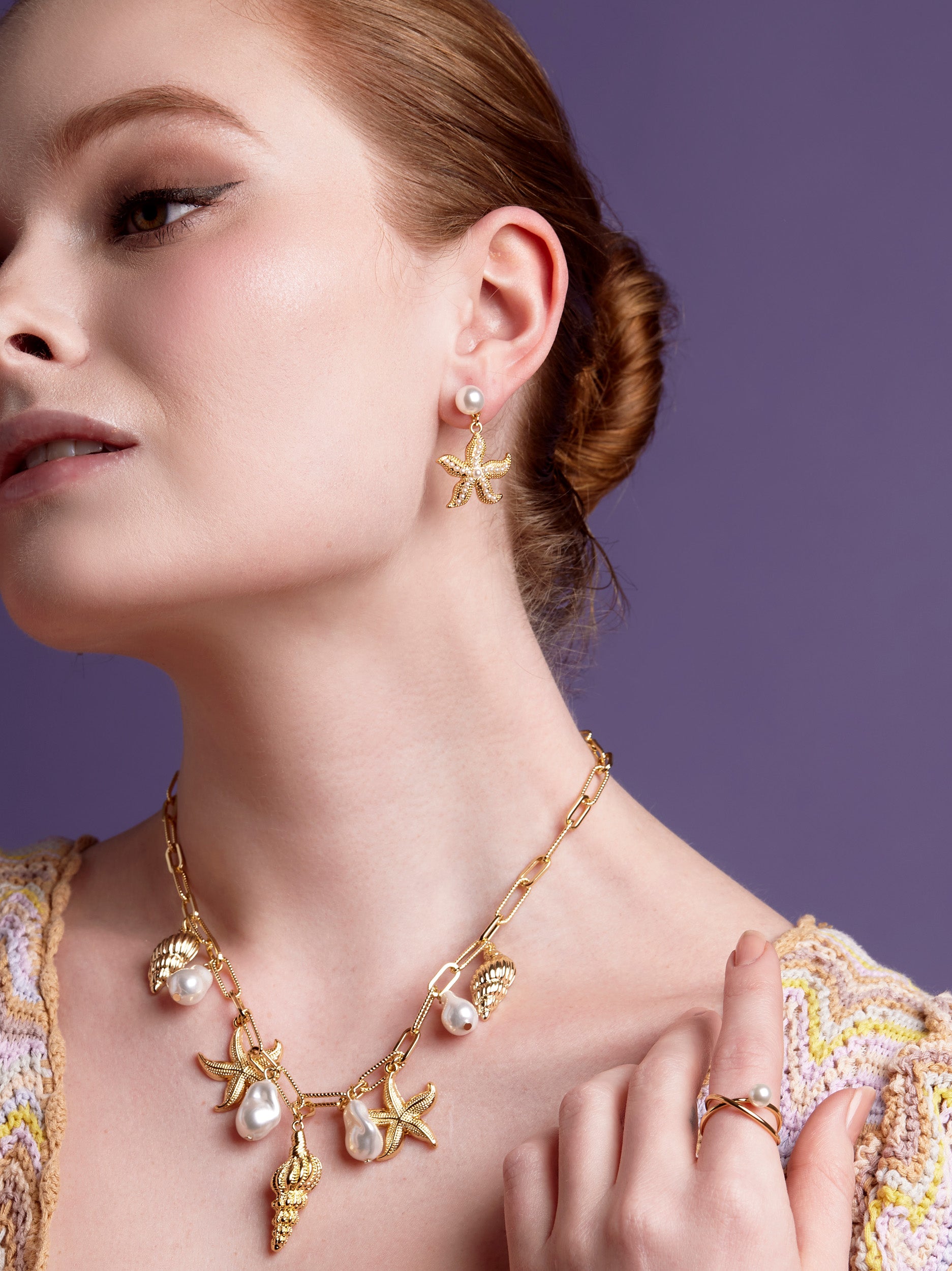 Stud earring featuring a radiant gold-tone starfish design adorned with delicate faux pearls
